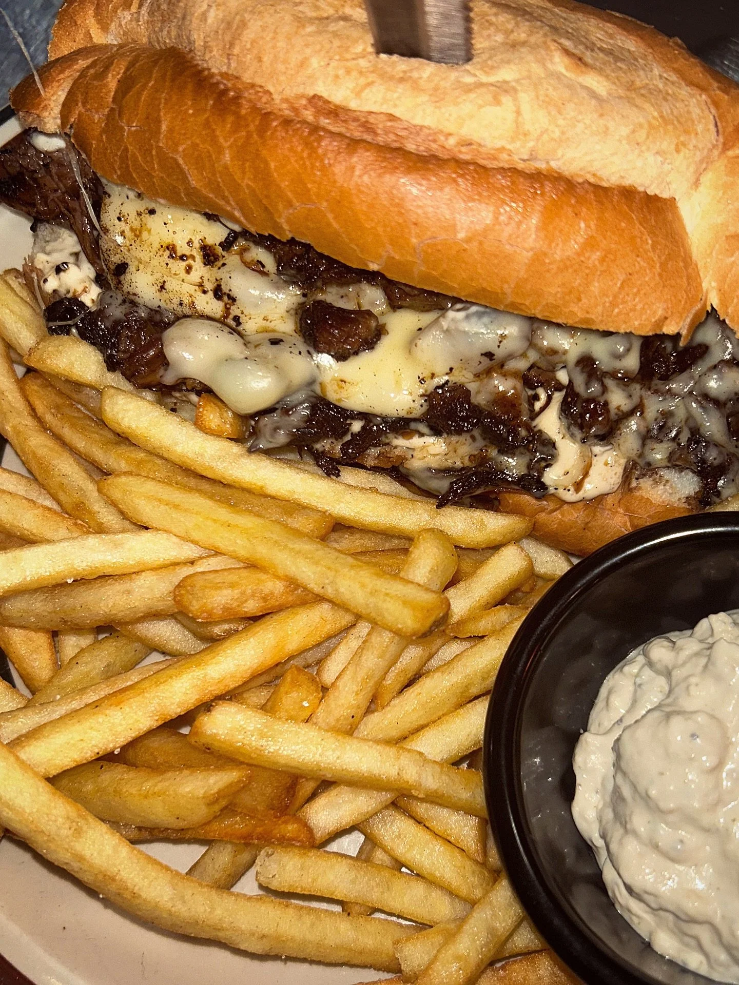 Brisket Po’ Boy + side fries + extra house made French onion dip for dippin’ & scoppin’ & schmearin’ โค๏ธ‍๐Ÿ”ฅ