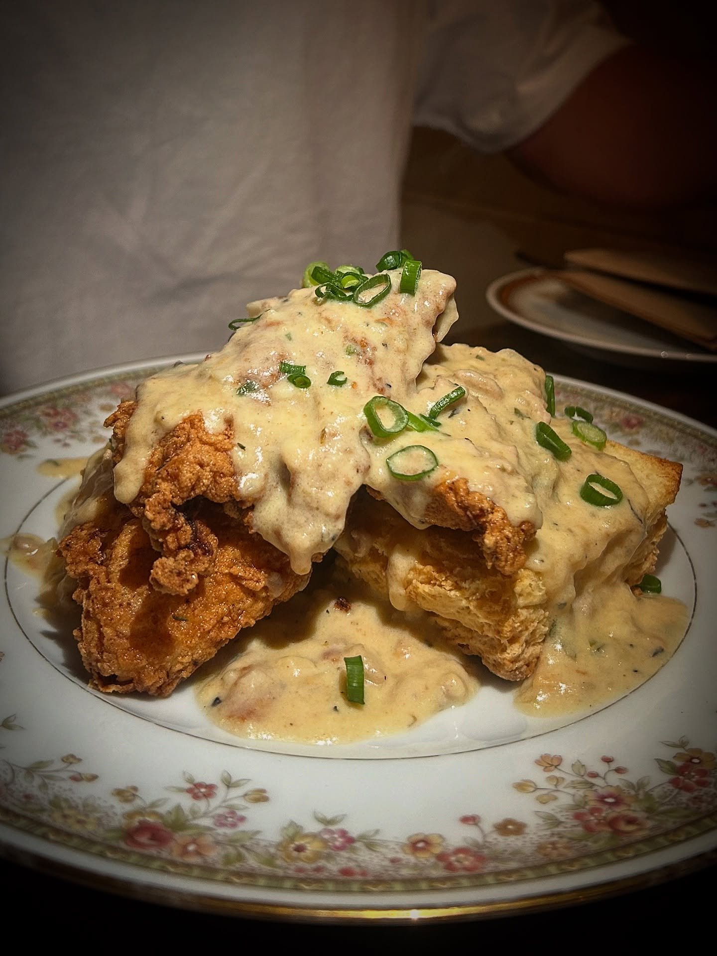 SoCo’s buttermilk fried chicken, buttery biscuits & creamy country gravy with pork sausage for dine in only ๐Ÿค